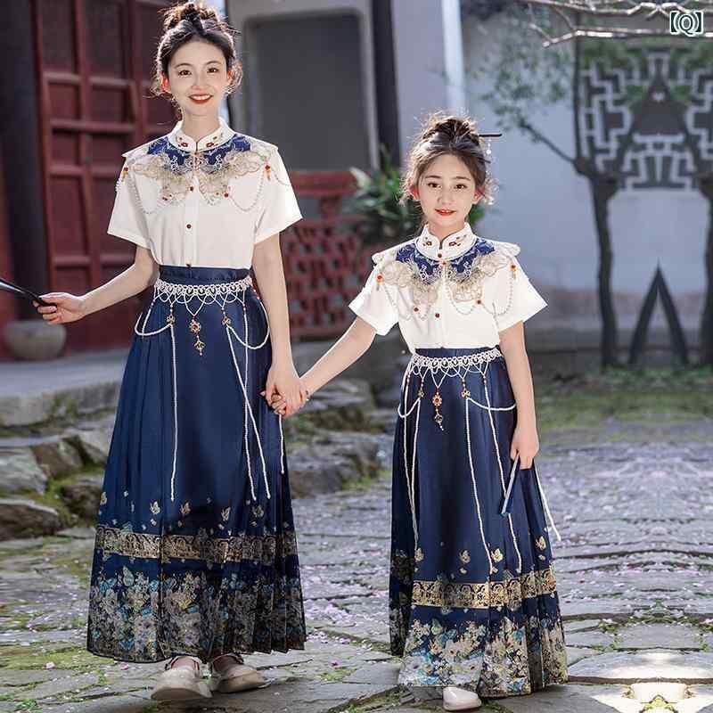 漢服 民族衣装 女の子 ガールズ レディース 親子コーデ 母娘ペア 中国風 中華風 古風 スカート ロングスカート セットアップ 薄手 柔らかい ポリエステル 綿混 夏服 披露宴 結婚式 礼服 フォーマル パーティー ドレス