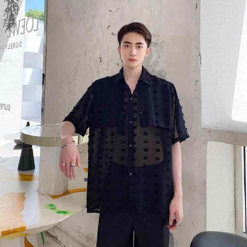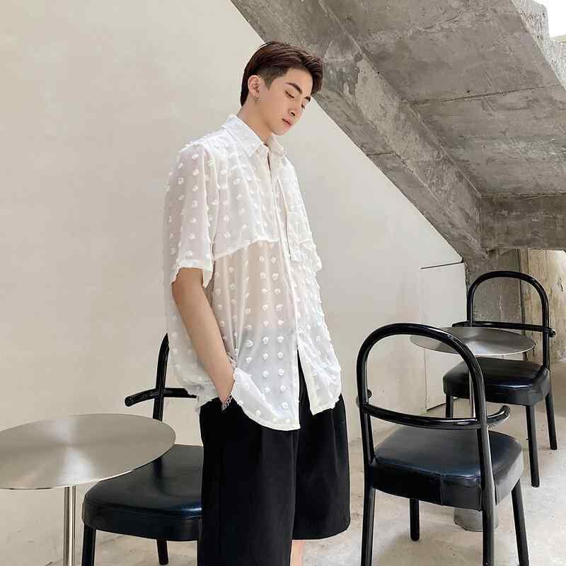 シャツ メンズ シースルー UVカット 半袖 ドット柄 ルーズフィット 角襟 薄手 スタイリッシュ シンプル カジュアル 普段使い 旅行 レジャー ポリエステル ホワイト ブラック
