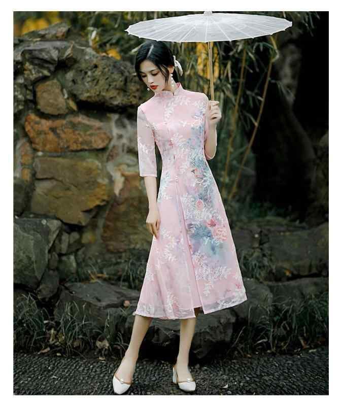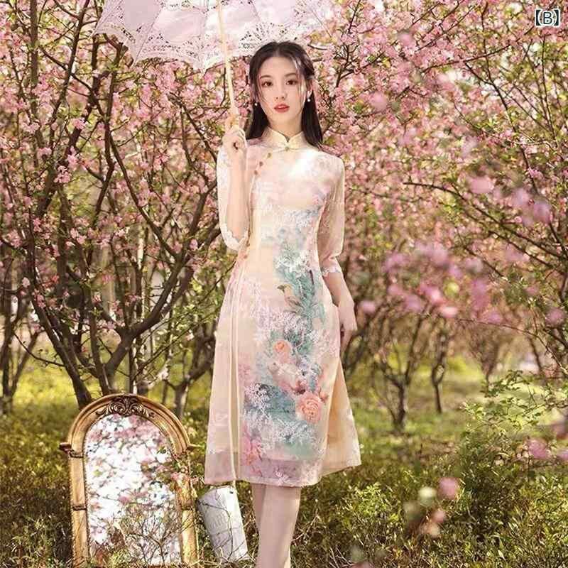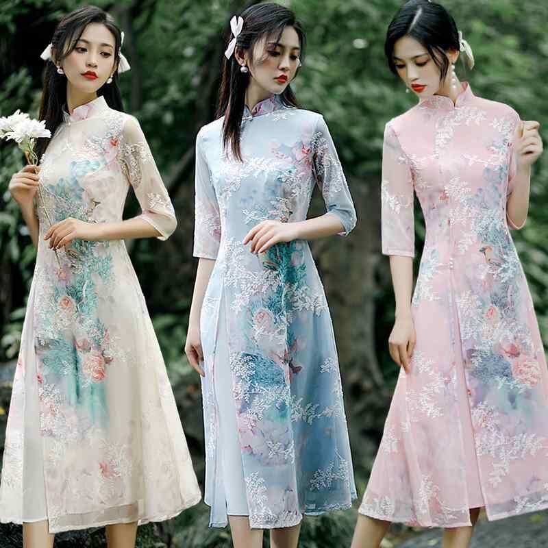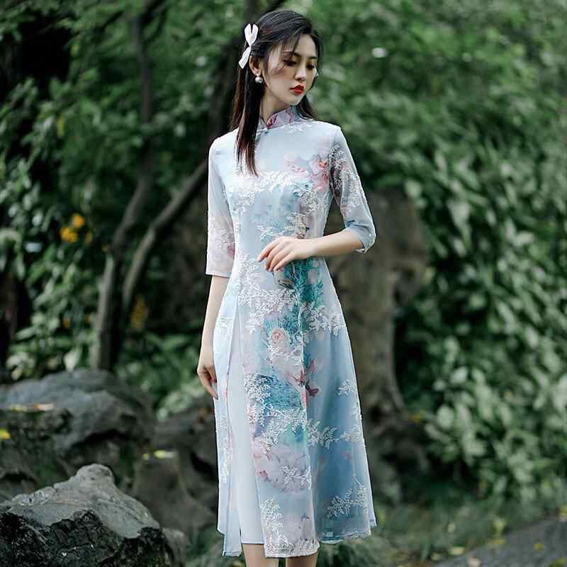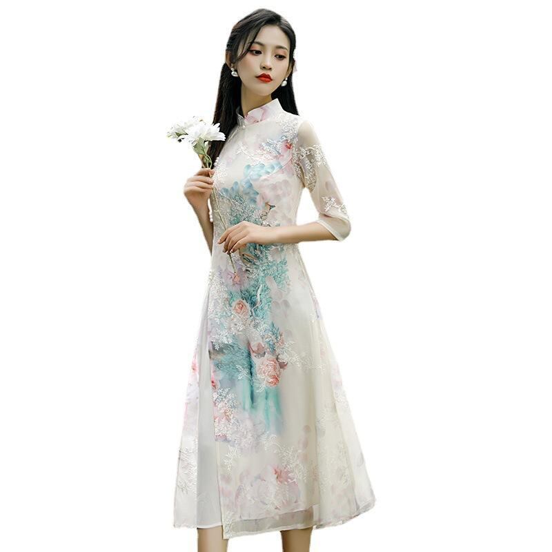 チャイナドレス レディース モダン 中国風 シフォン ポリエステル ロング丈 プリンセス風 清楚 かわいい 手縫いビーズ 花柄 五分袖 ハイサイドスリット スタンドカラー シャンパン ブルー ピンク