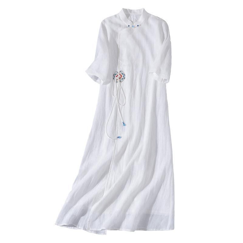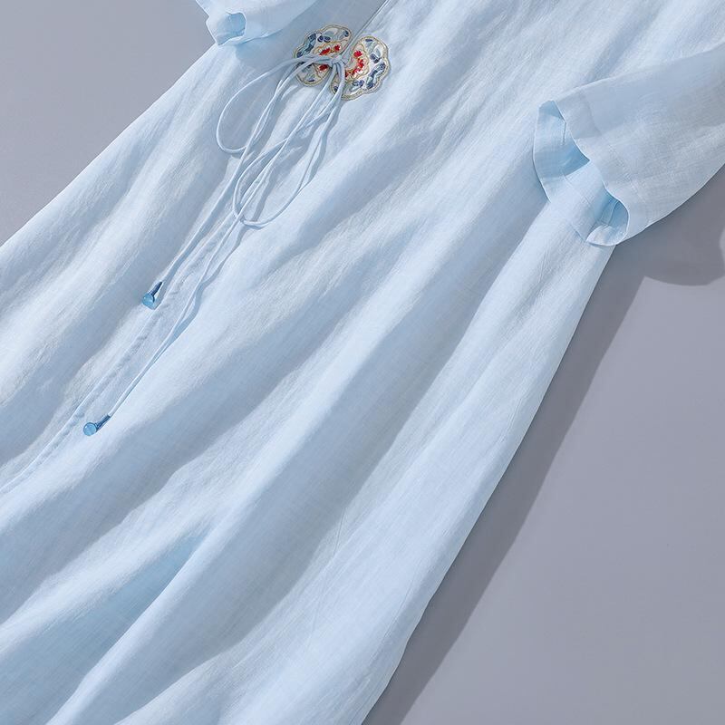 ワンピース レディース オフィス 通勤 きれいめ 中国風 マオカラー スタンドカラー 刺繍 サイドタイ Aライン ミモレ丈 五分袖 ラミー リネン コットン ライトブルー オフホワイト