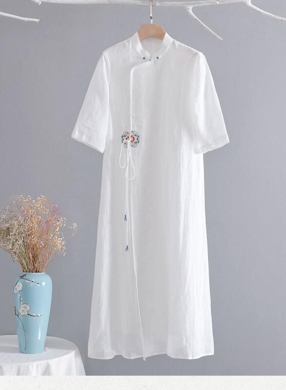 ・カテゴリ: ワンピース・スタイル: オフィスカジュアル・タイプ: ベーシック・主な素材: ラミー100%・裏地素材: 綿100%・ネックライン: スタンドカラー・袖丈: 5分袖・袖タイプ: レギュラー・スカート丈: ミディ丈・スカートシルエット: Aライン・柄: 無地・デザイン要素: 刺繍、サイドリボン、手作りボタン、同色パイピング・セット内容: 単品・カラー展開: ライトブルー、オフホワイト・サイズ展開: S、M、L、XL・対象年齢層: 25-29歳