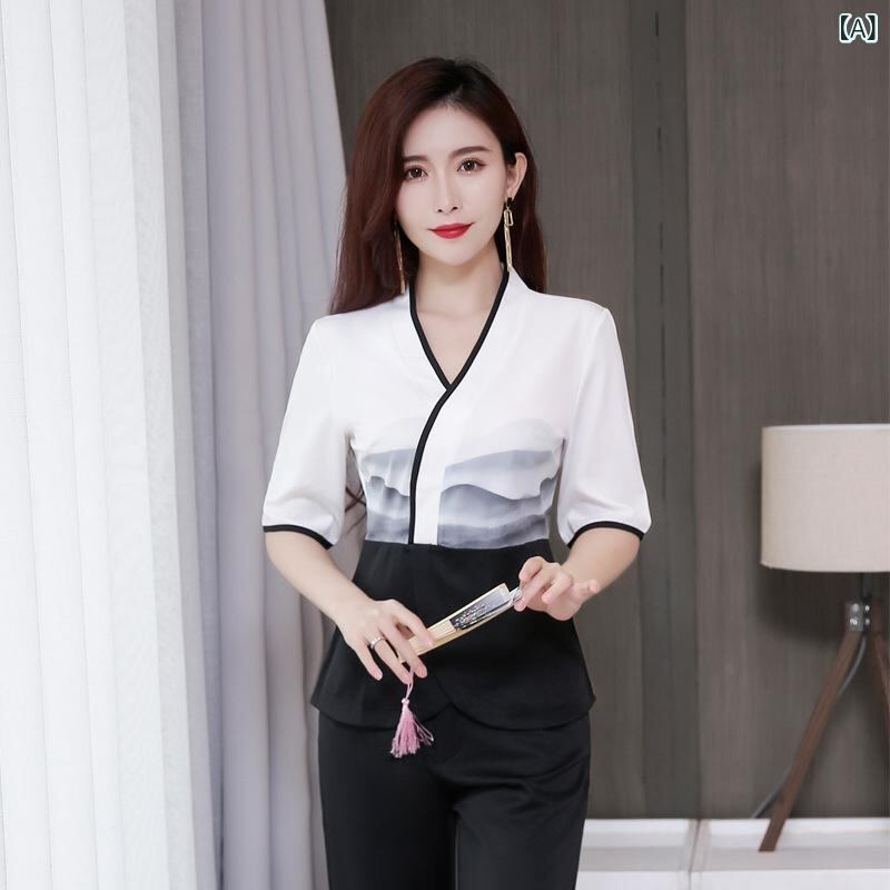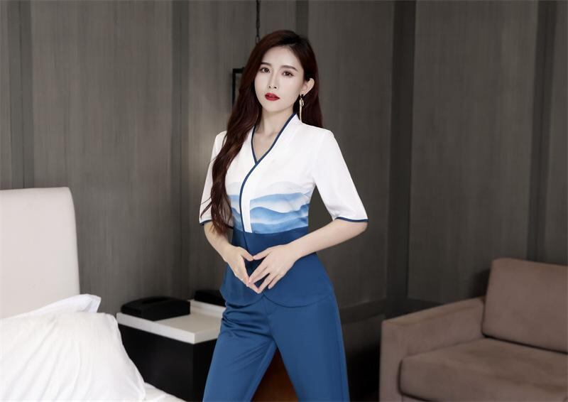 ユニフォーム レディース 女性用 エステ サロン フットマッサージ 足つぼ リラクゼーション スパ ホテル 施術着 制服 夏 薄手 軽量 吸湿速乾 通気性 快適 肌触り 綿 アクリル混紡 上品 エレガント ブラック ブルー