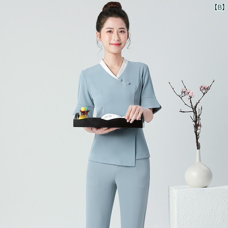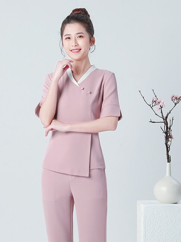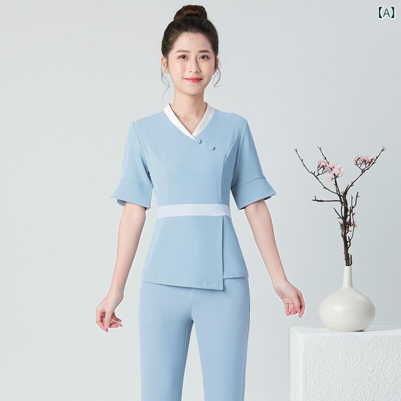 制服 レディース 女性用 エステティシャン マッサージ師 サロン スパ 美容院 リラクゼーション 上質 業務服 吸湿速乾 Vネック 上下セット 半袖 長袖 キュプラ リヨセル素材