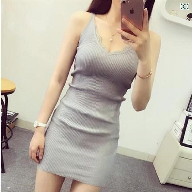 ワンピース レディース ミディ丈 キャミソール ノースリーブ ニット レース Vネック Aライン ハイウエスト 切り替え 無地 ポリエステル ストレッチ エレガント カジュアル オフィス