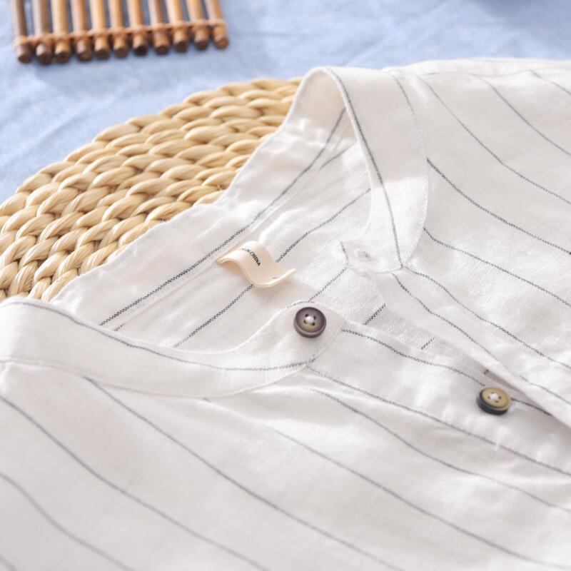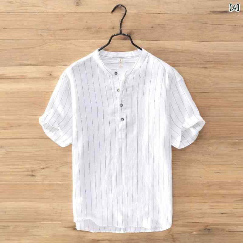 シャツ メンズ リネン 麻 半袖 ストライプ ボーダー柄 スタンドカラー プルオーバー 薄手 軽量 ゆったり ルーズフィット カジュアル 普段使い ノーアイロン お手入れ簡単 夏用 民族風