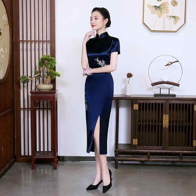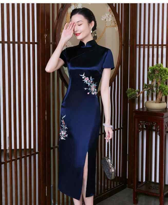 チャイナドレス レディース 精緻な刺繍 改良デザイン フォーマルドレス ワンピース 大きいサイズ ミディ丈 アセテートサテン ポリエステル スタンドカラー 3分袖 紺色 ワインレッド レトロ風