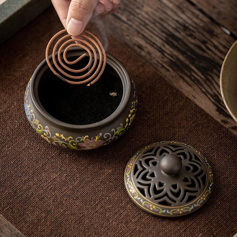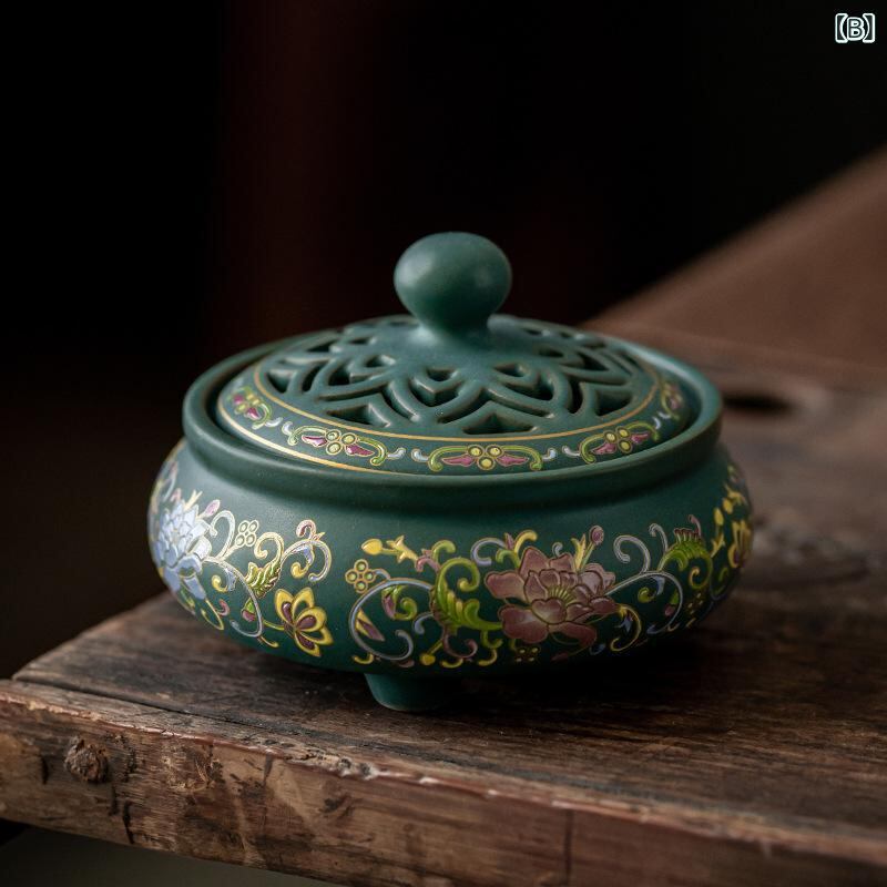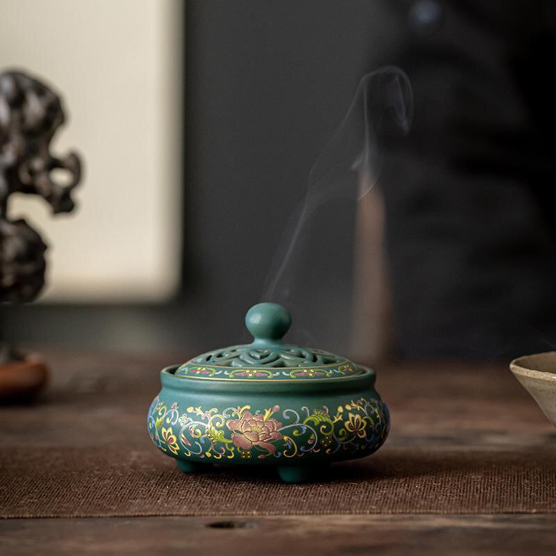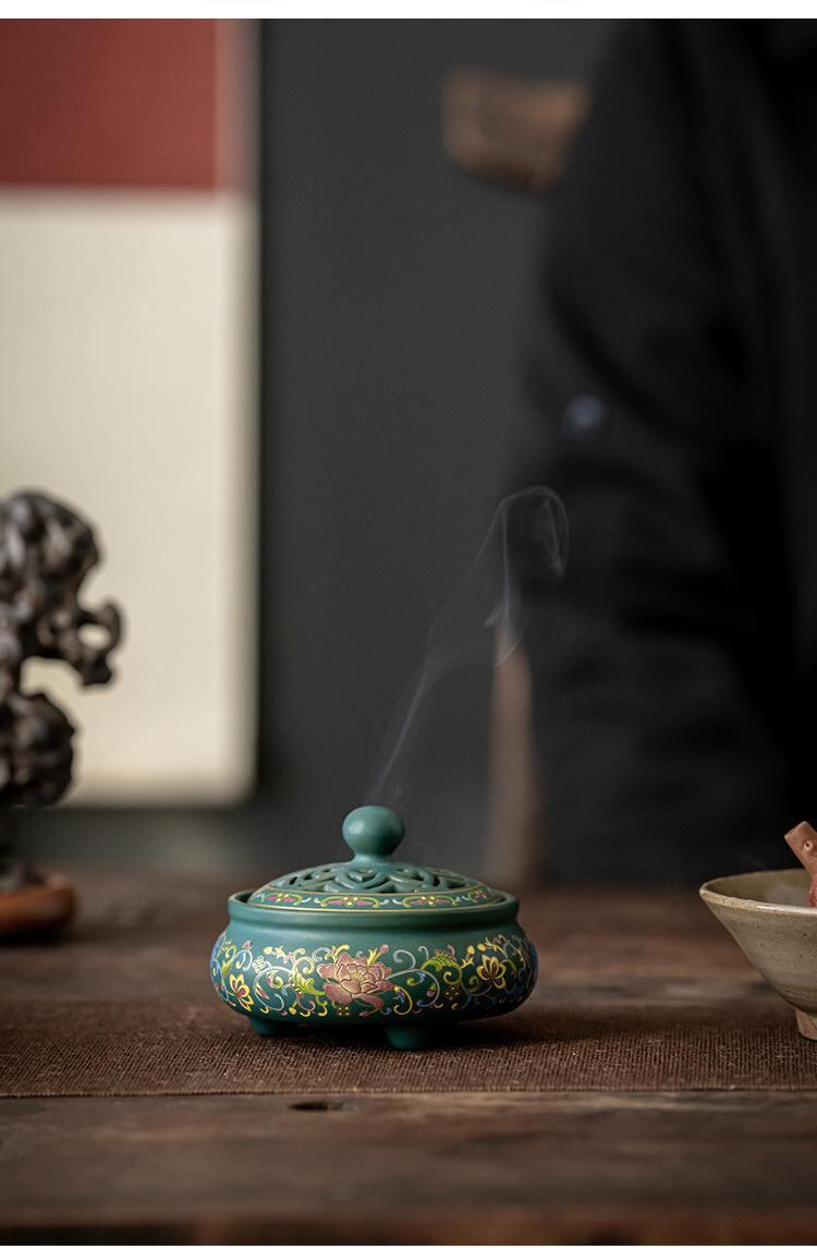 香炉 陶器製 レトロ アンティーク調 室内用 お香立て 線香立て 蚊取り線香皿 インセンスホルダー 白檀 沈香 アロマ 癒し リラックス 瞑想 和室 リビング 玄関 書斎 インテリア ブラウン ライトグリーン
