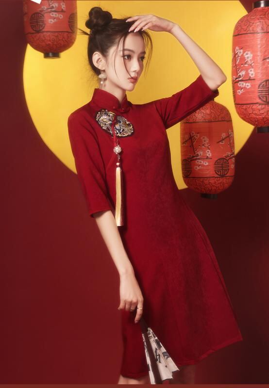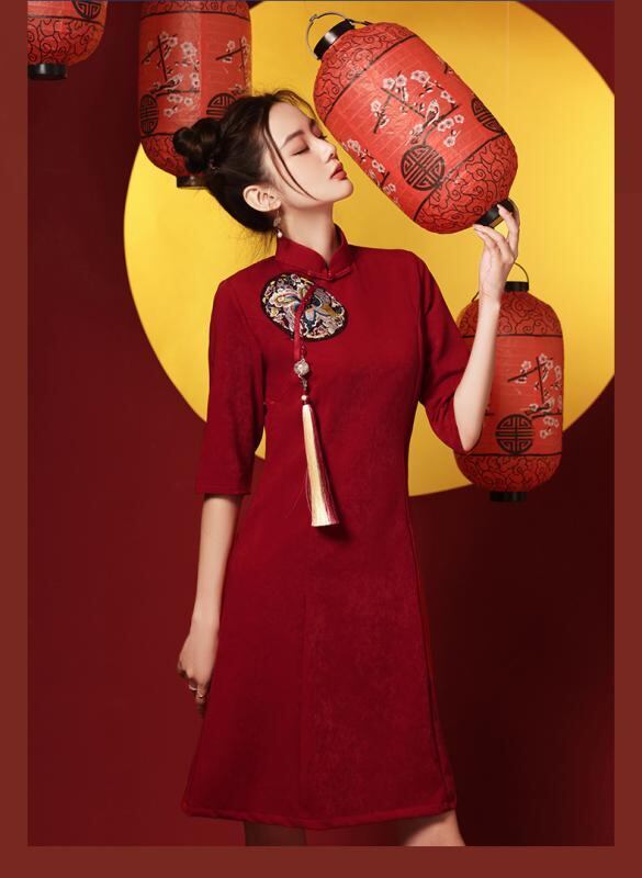チャイナドレス レディース 結婚式 披露宴 パーティードレス ワインレッド ボルドー 低身長 小柄向け 改良版 現代風 中華風 立襟 七分袖 ショート丈 フォーマル お呼ばれ ワンピース