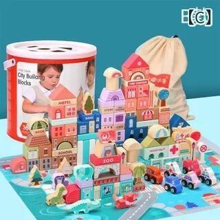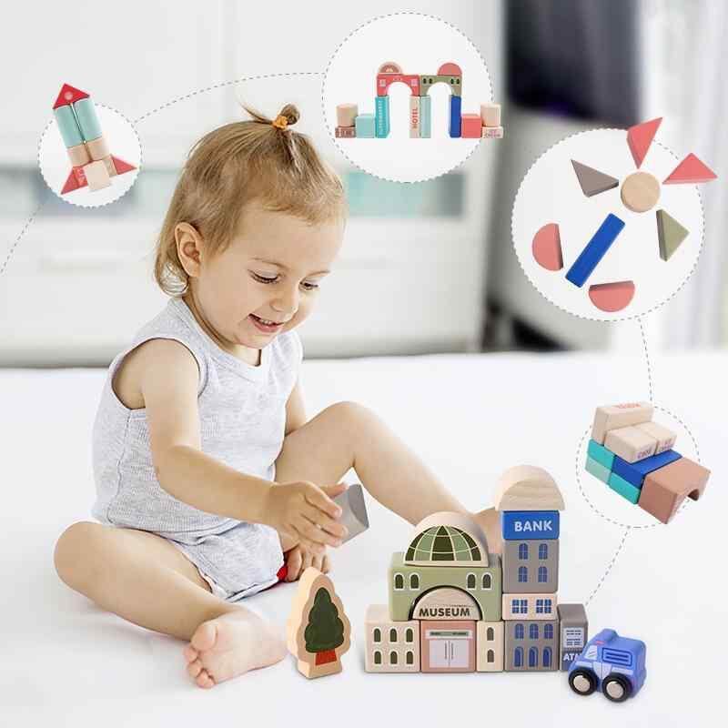 積み木 子供用 木製 マカロンカラー 大型ブロック 115ピース 街 建物 乗り物 知育玩具 組み立て学習 パイン材 安全 水性塗料 想像力 集中力