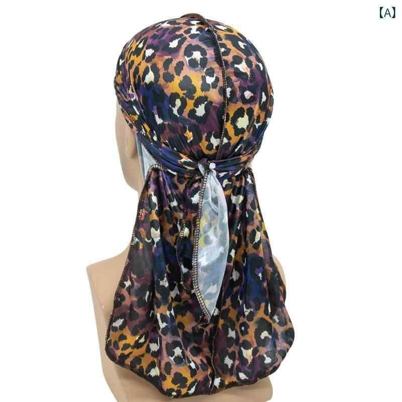 ドゥーラグ ヘッドラップ サテン ヒョウ柄 プリント ヒップホップ ストリート ダンス 伸縮性 通気性 日よけ 首元保護 ロングテール つばなし ドーム型 厚手 高級感 多色展開