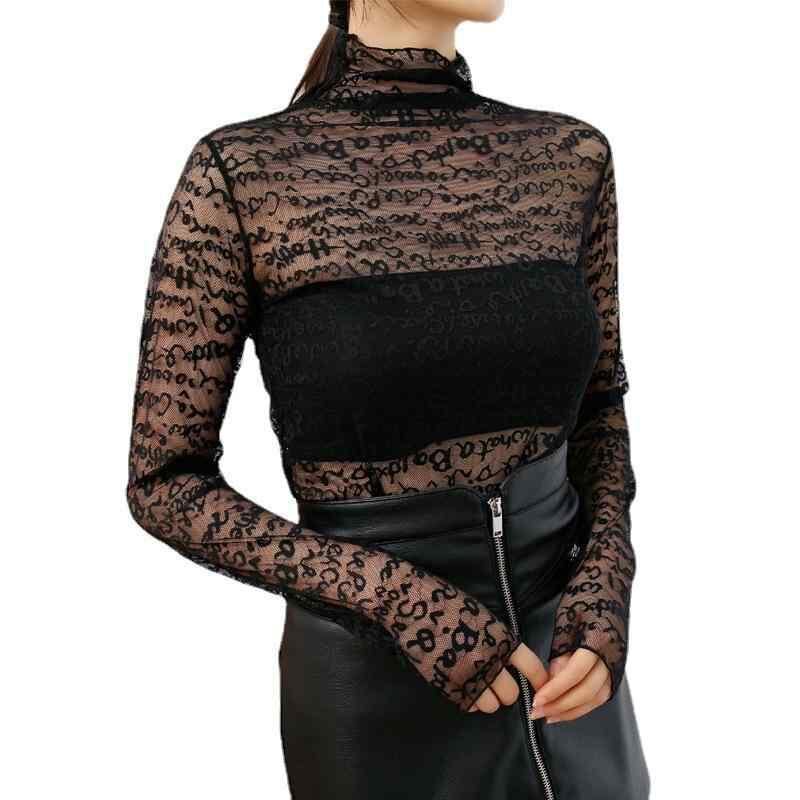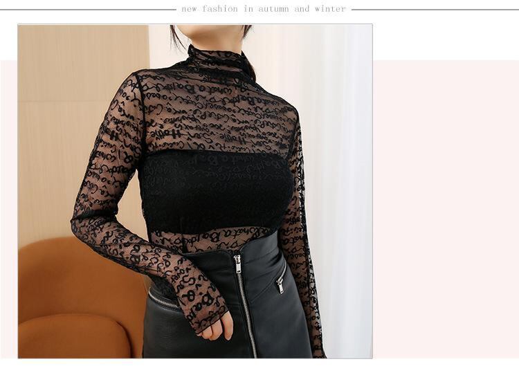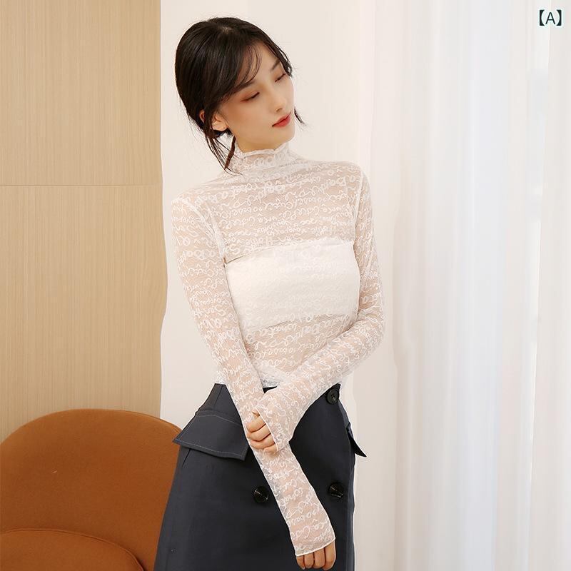 トップス レディース シアー レース ハイネック 長袖 メッシュ 英字ロゴ プルオーバー スリムフィット インナー 通気性 通勤 カジュアル カットソー ナイロン ホワイト ブラック ベージュ