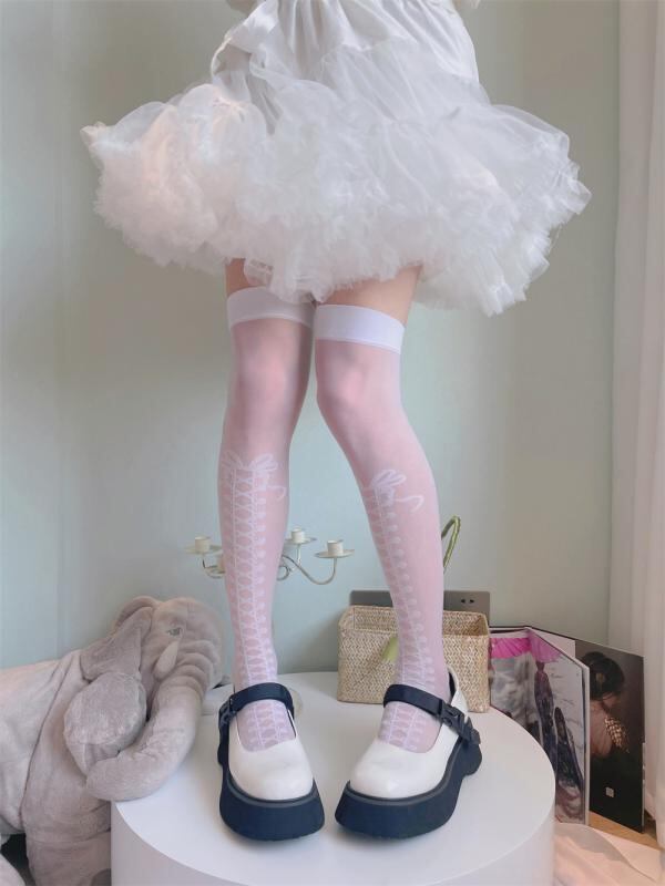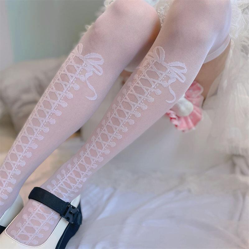 サイハイソックス ジュニア ロリータ スイート クロスストラップ 編み上げ 薄手 ジャカード織り ドット柄 ベロア素材 スタイルアップ ホワイト ブラック
