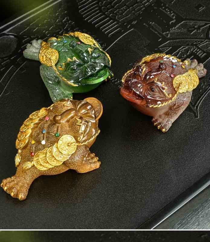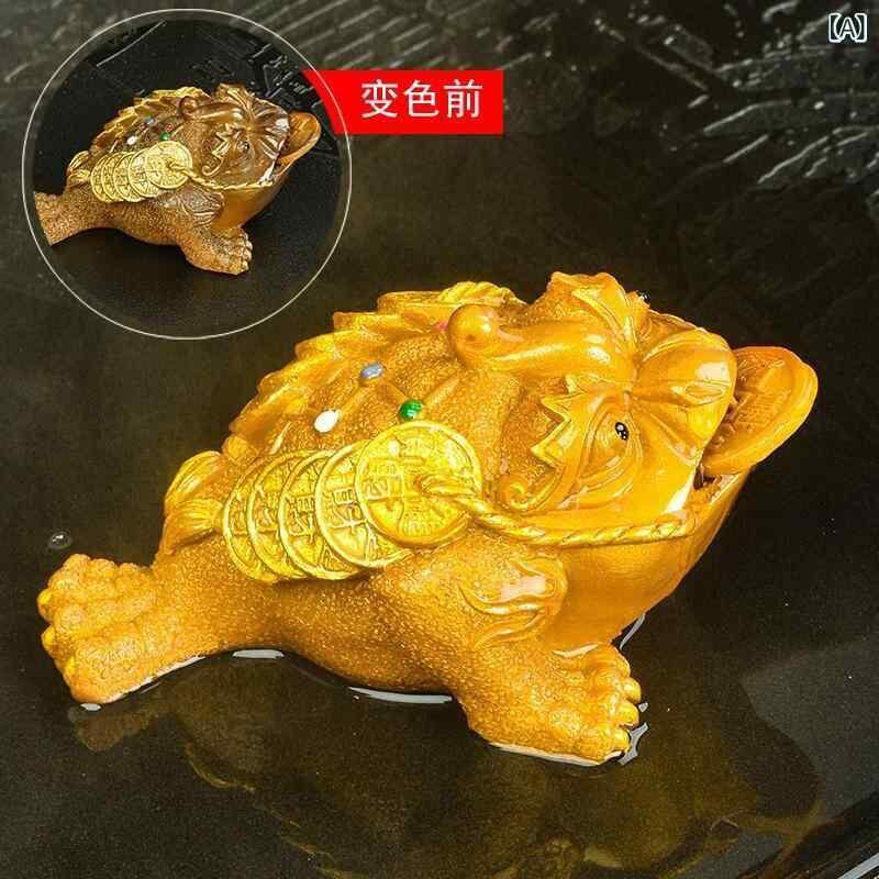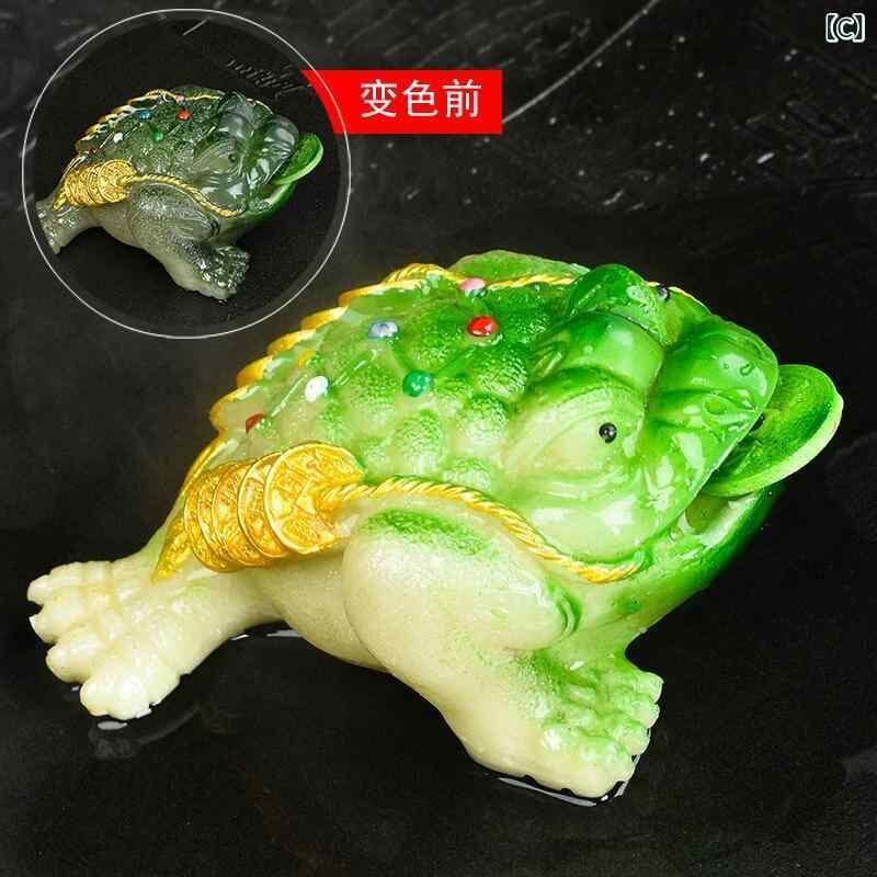 茶器飾り 金蟾 ヒキガエル 置物 変色 金運 招財 ラッキーアイテム 茶道具 茶卓 卓上 飾り物 樹脂製 おしゃれ シンプル モダン 金色 赤色 緑色