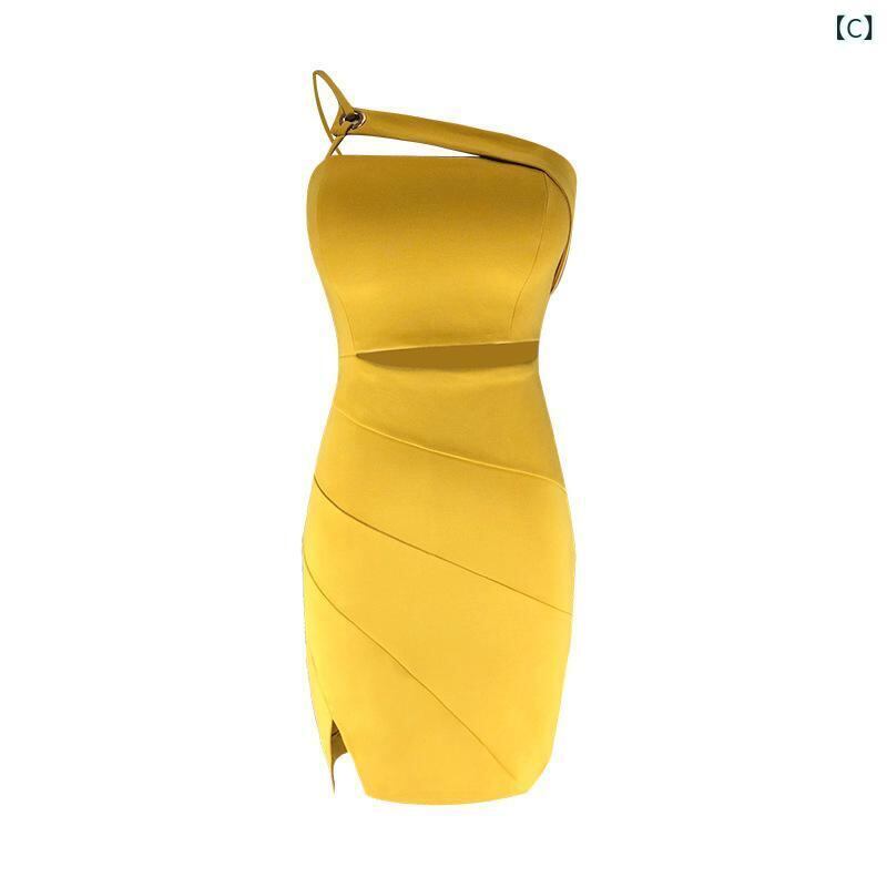 ワンピース レディース セクシー ローカット ワンショルダー ミニドレス バックオープン スリット タイト スタイルアップ デザイン 個性的 上品 エレガント ポリエステル ノースリーブ プリーツ 無地 ホワイト ピンク イエロー ブラック
