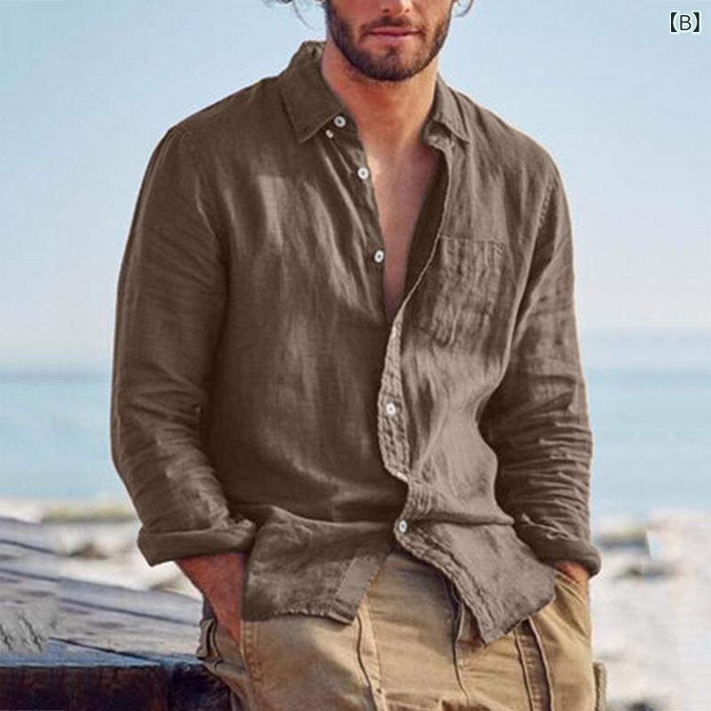 シャツ メンズ 無地 カジュアル 襟付き 前開き 綿麻 ゆったり 長袖 レトロ デイリーユース リラックスウェア ウォッシュコットン 春夏秋 ポケット付き ブラック ブラウン グレー グリーン