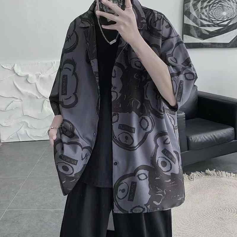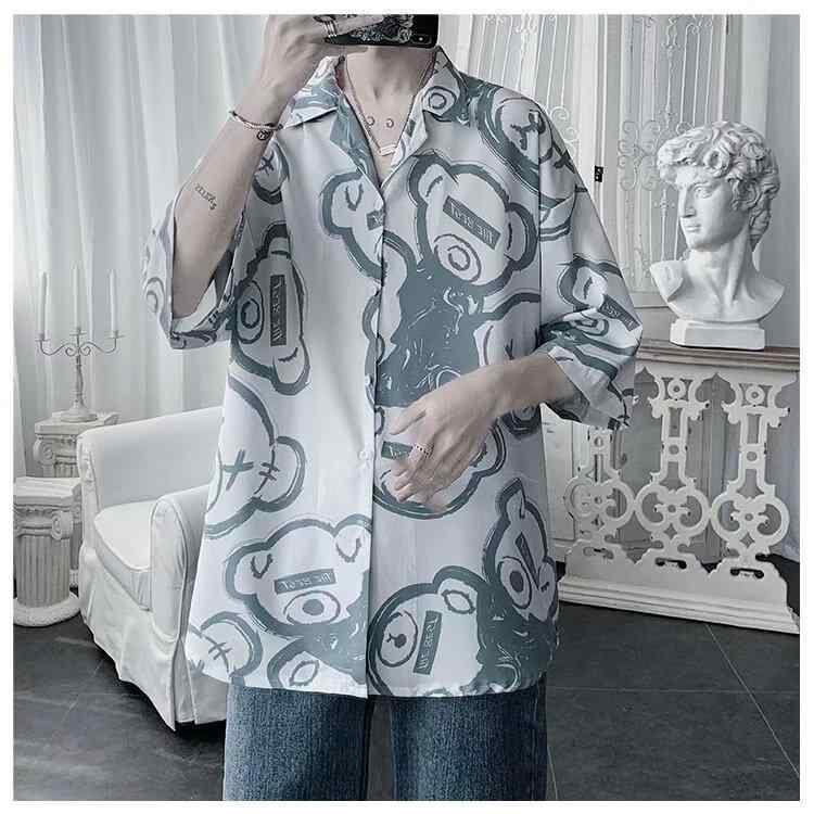シャツ メンズ 薄手 半袖シャツ 接触冷感 ゆったり オーバーサイズ 開襟シャツ 韓国風 ストリート系 プリント柄 クマ柄 カジュアル 夏用 ポリエステル ストレッチ素材 黒 ピンク ブルー おしゃれ トップス