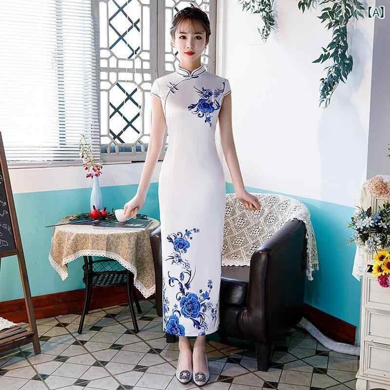 チャイナドレス レディース ロング丈 大きいサイズ対応 中国風 普段使い デイリーユース 発表会 イベント パーティー シルク調 ポリエステル スタイルアップ ストレッチ ノースリーブ スタンドカラー 斜め襟 ハイウエストスリット 透け防止