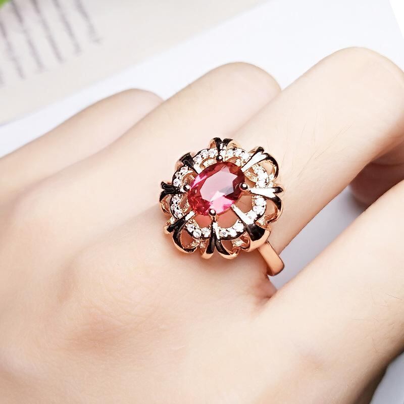 指輪 レディース 透かし彫り 花柄 フェニックスモチーフ レッドストーン フリーサイズ オープンリング エレガント 華やか 高級感 ファッションリング 銅製 ローズゴールドカラー パーティー 結婚式 デイリーユース