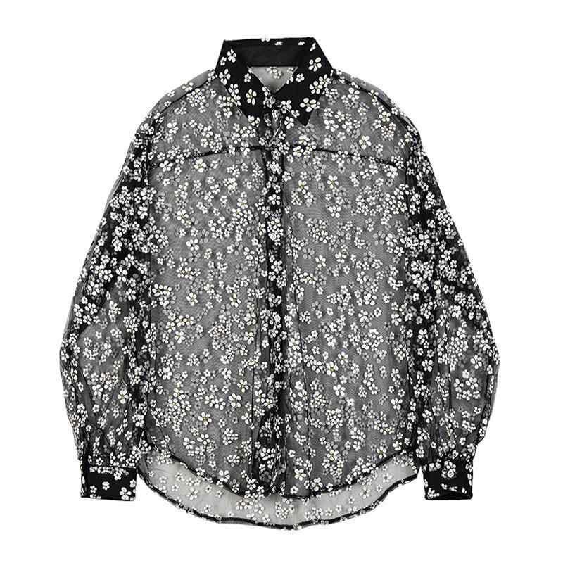 シャツ メンズ シースルー メッシュ 花柄 長袖 薄手 軽量 ゆったり オーバーサイズ ポリエステル ブラック 黒 透け感 パーティー イベント ステージ衣装 高級感 襟付き