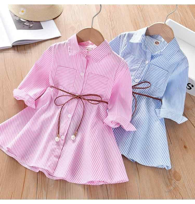 ワンピース 女の子 キッズ ストライプ柄 シャツワンピース 春 夏 秋 コットン 韓国風 おしゃれ かわいい 長袖 普段使い カジュアル プリンセスライン ピンク ライトブルー カーキ