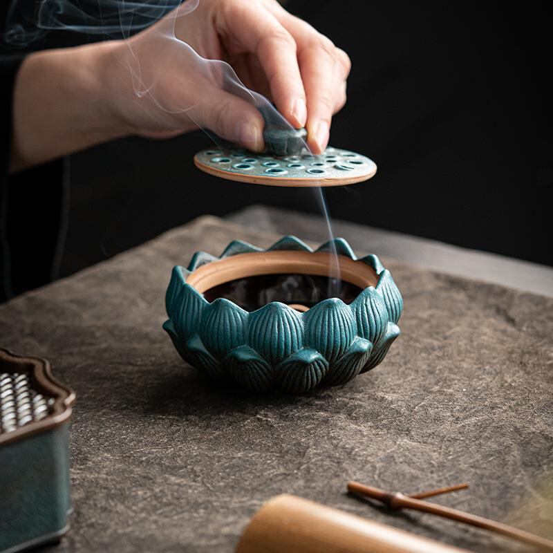 香炉 蓮の花 陶器 室内用 家庭用 禅風 和風 渦巻き線香 白檀 アロマ 香道用 お香立て 置き物 インテリアオブジェ 開運 縁起物 リビング 書斎 寝室 リラックス 瞑想