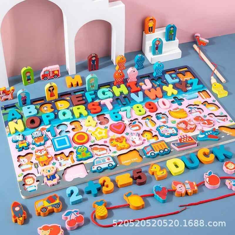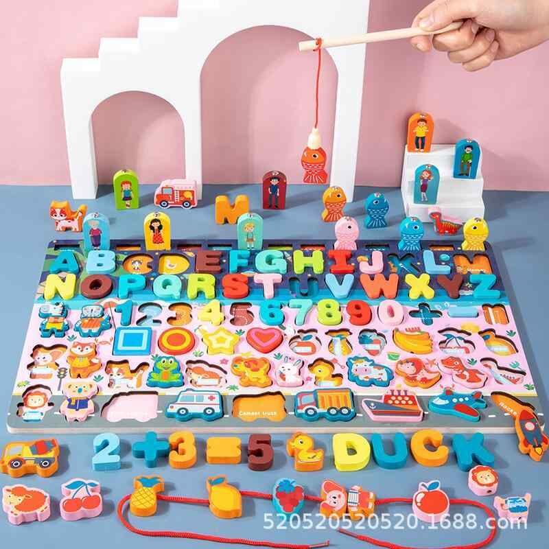 知育玩具 キッズ 子供 木製 マグネット式 釣りゲーム 数字パズル 数合わせ 図形認識 多機能 パズルボード 早期学習 思考力 集中力