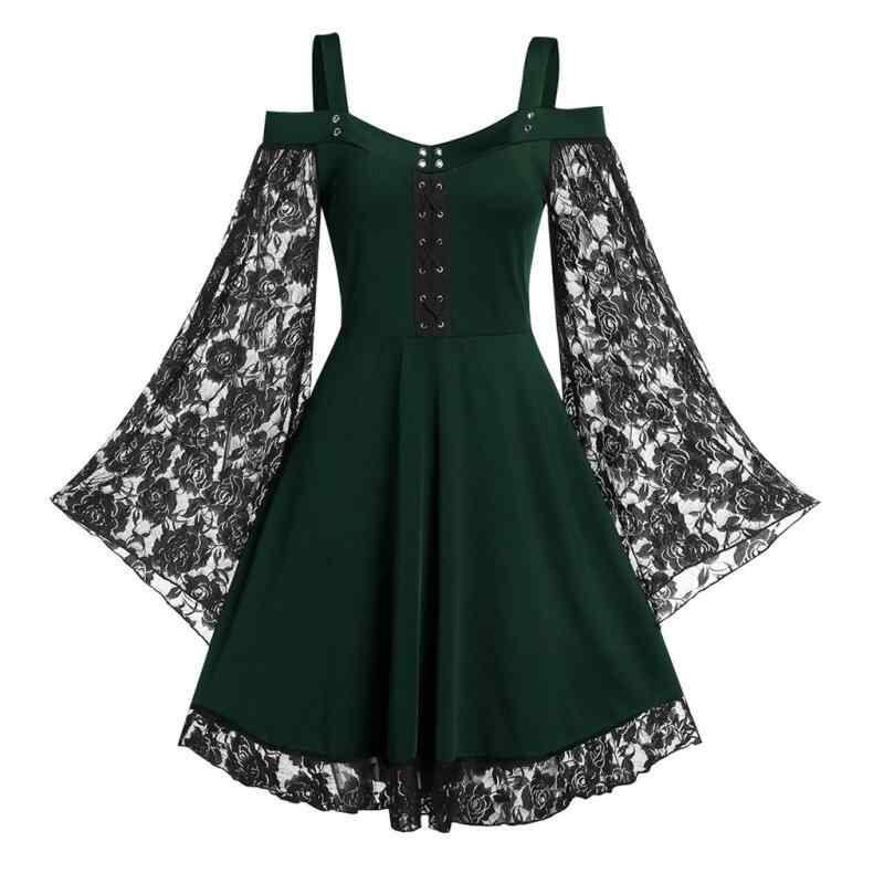 ワンピース レディース オフショルダー レトロ 欧米スタイル レース切り替え フレアスリーブ 長袖 ミディ丈 タイトシルエット プルオーバー 無地 ストレッチ ポリエステル混 ブラック ワインレッド ダークグリーン
