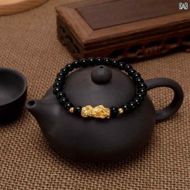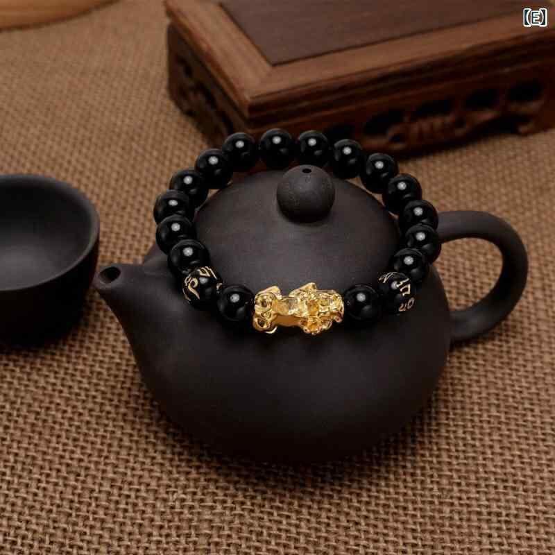 ブレスレット 男女兼用 カップル ペア 天然 黒曜石 貔貅 金運招来 ラッキーアイテム 六字真言 数珠 シンプル 伸縮性 パワーストーン 金珠 民族風