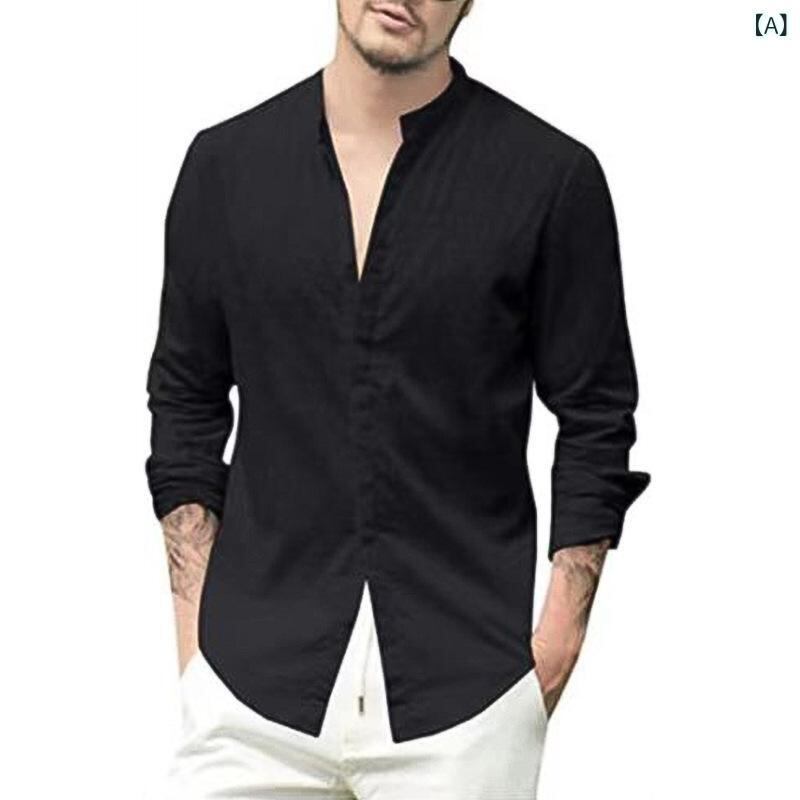 シャツ メンズ レトロ スタンドカラー 前開き カジュアル 長袖 綿麻 無地 綿混 通気性 スリムフィット しわになりにくい 普段使い ブリティッシュスタイル 黒 白 グレー