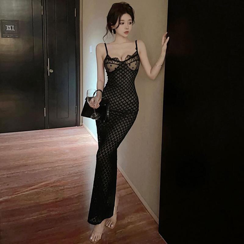 ワンピース レディース セクシー フェミニン レース キャミソール ロングドレス タイトシルエット エレガント ドレッシー パーティー お呼ばれ 結婚式 フォーマル ハイウエスト ブラック