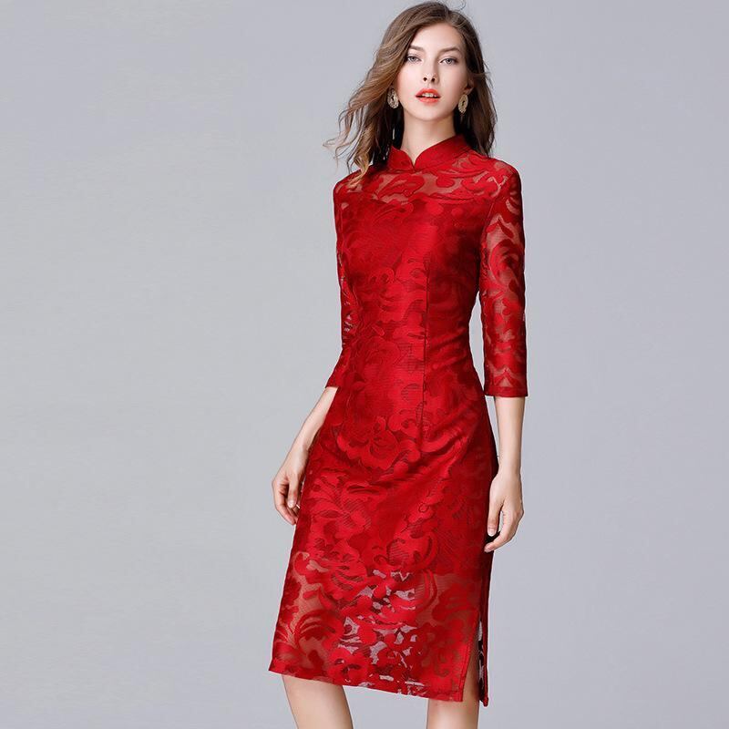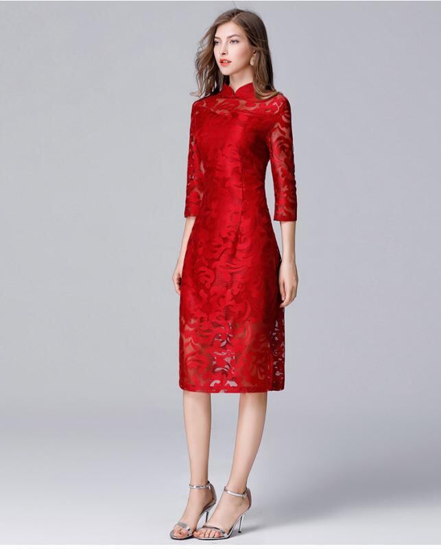 ワンピース レディース 大きいサイズ ぽっちゃりさん スタンドカラー レース 七分袖 裏起毛 厚手 ミモレ丈 タイト ストレートシルエット エレガント きれいめ 通勤 オフィス カジュアル ポリエステル素材