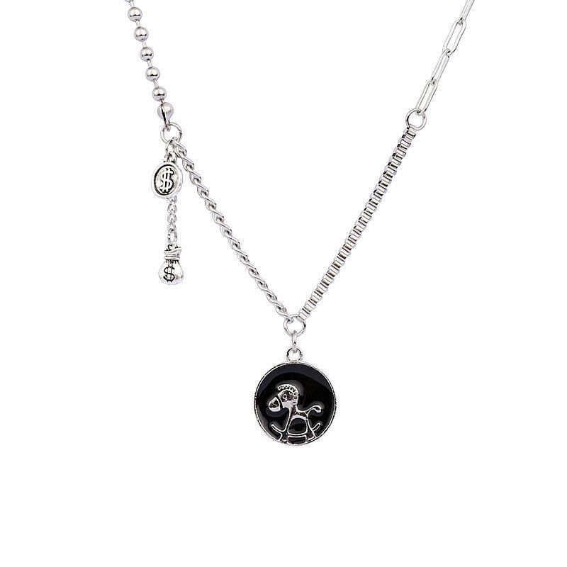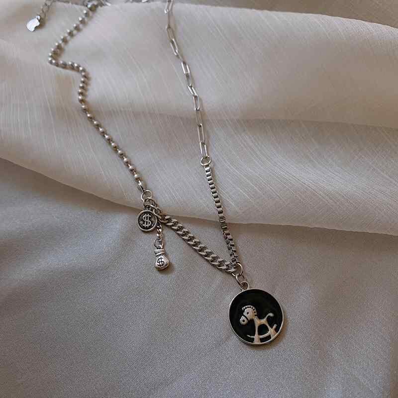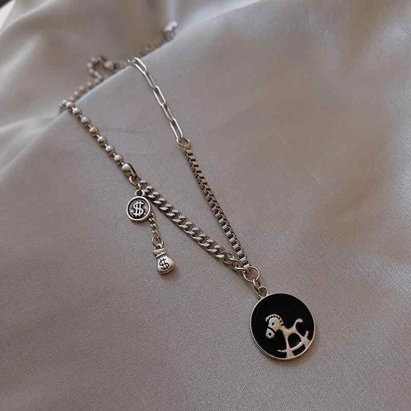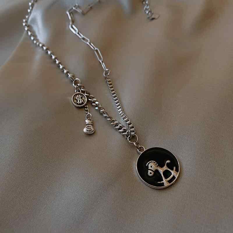 ネックレス レディース 馬 コインモチーフ 丸型ペンダント ロングネックレス シンプル デイリーユース オフィススタイル おしゃれ 金属製 合金製 蛇骨チェーン 銀色 高級感 ラッキーアイテム