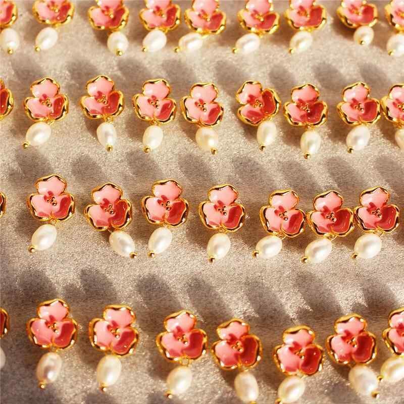 ピアス レディース ドロップエナメル フラワーモチーフ 淡水パール ピンク ゴールド エレガント 上品 かわいい 韓国風 フェミニン デイリー オフィス カジュアル メタル
