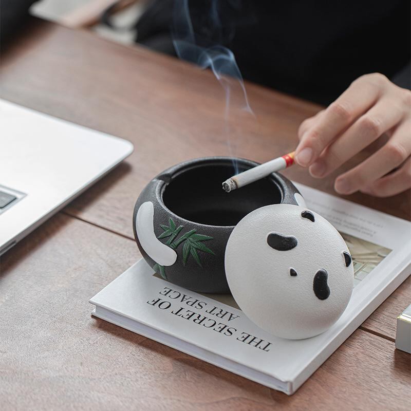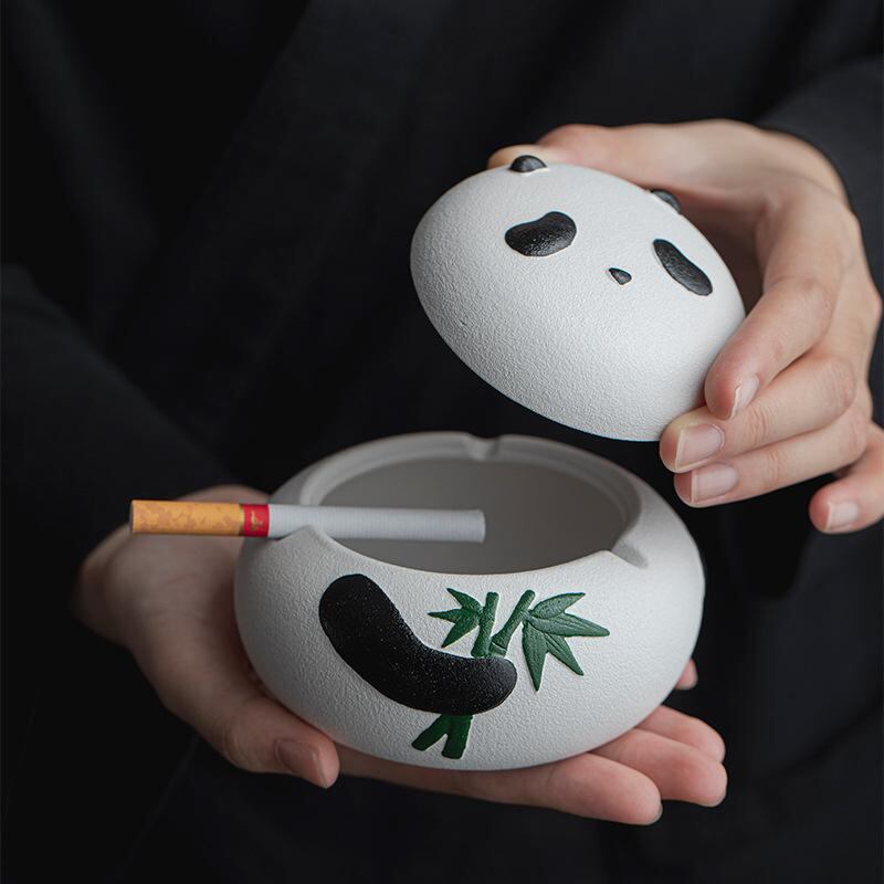 灰皿 パンダ 陶器製 蓋付き 防風 灰飛び防止 家庭用 リビング オフィス 卓上 屋内 屋外兼用 白 黒 おしゃれ かわいい ユニーク デザイン