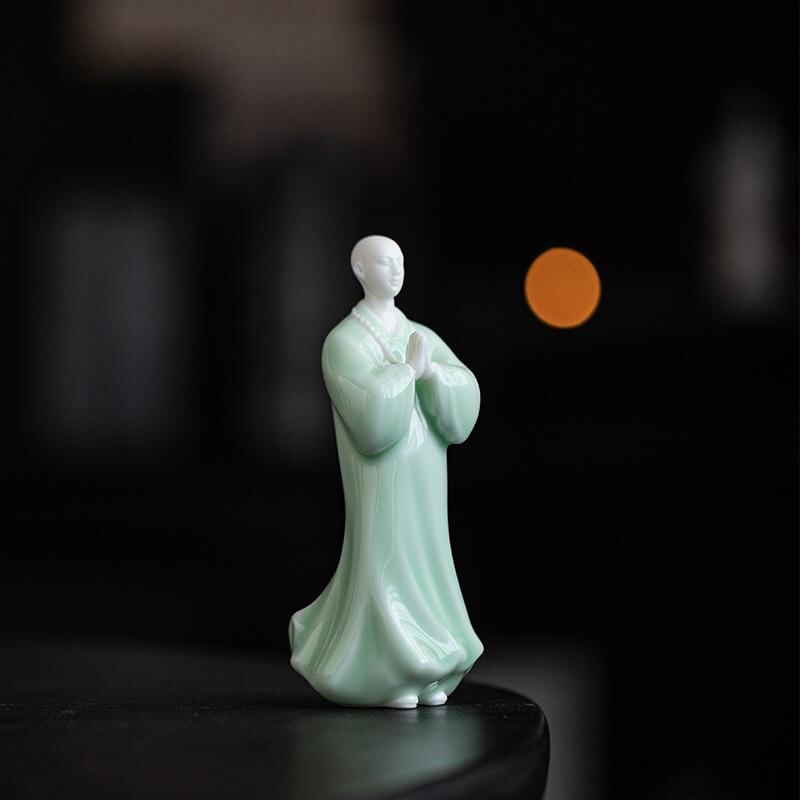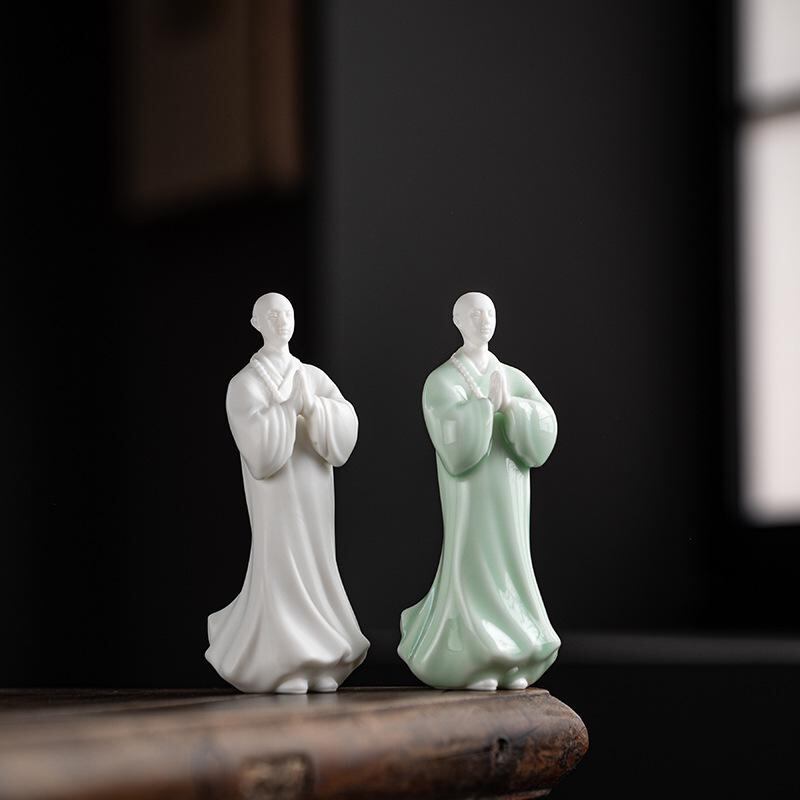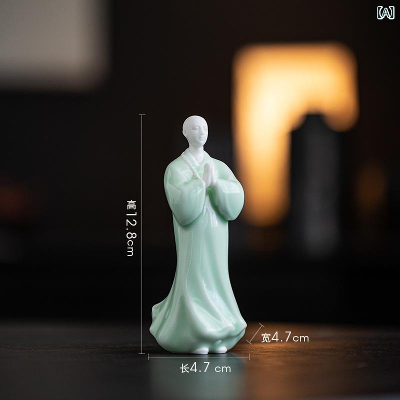 置物 小坊主 陶器 セラミック 禅スタイル 中国風 リビング 書斎 茶室 玄関 卓上 インテリア 装飾 和モダン 工芸品 フィギュア 青磁 白磁 癒し空間 雰囲気作り 静穏 デスク飾り 和室飾り オブジェ