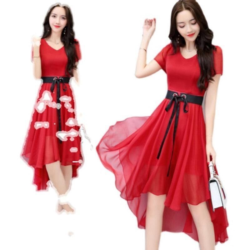 ワンピース レディース 韓国風 シフォン ミディ丈 Vネック 半袖 ハイウエスト Aライン アシンメトリー 無地 体型カバー 着痩せ効果 大きいサイズ 大人カジュアル 上品 ポリエステル ホワイト レッド ブラック
