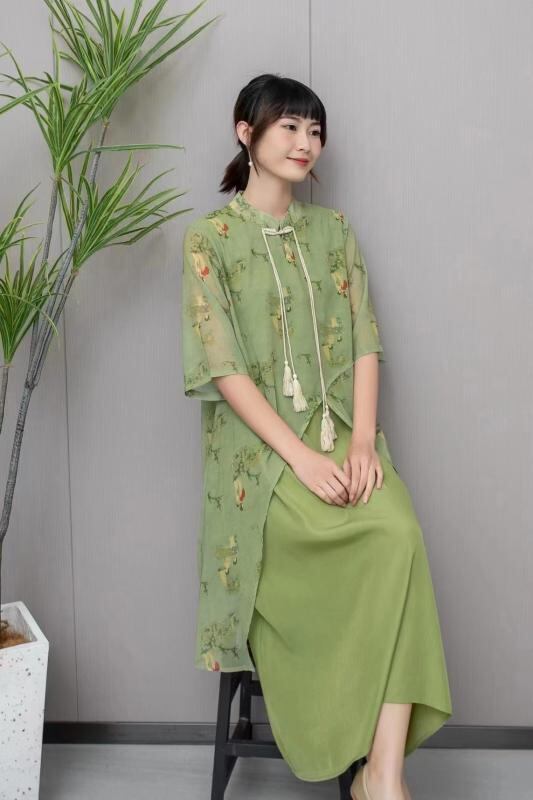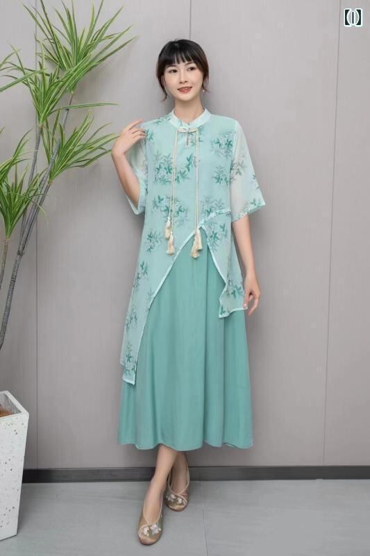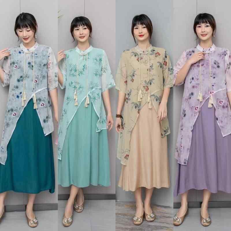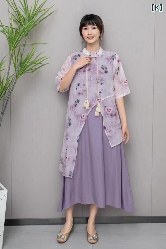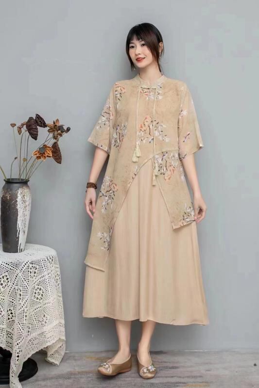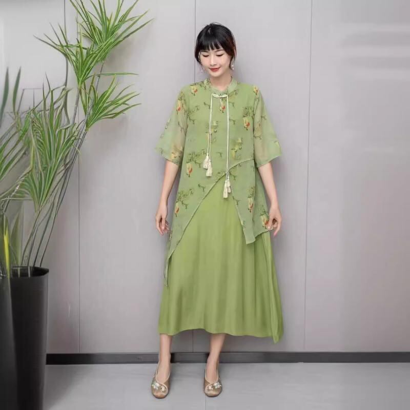 ワンピース 中国風 改良 旗袍風 スタンドカラー 五分袖 ゆったり 大きいサイズ レイヤード レトロ クラシック カジュアル リゾート 旅行 デイリー テンセルコットン ポリエステル ミモレ丈 花柄 サマードレス