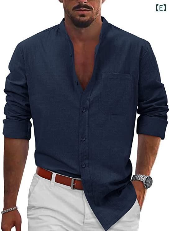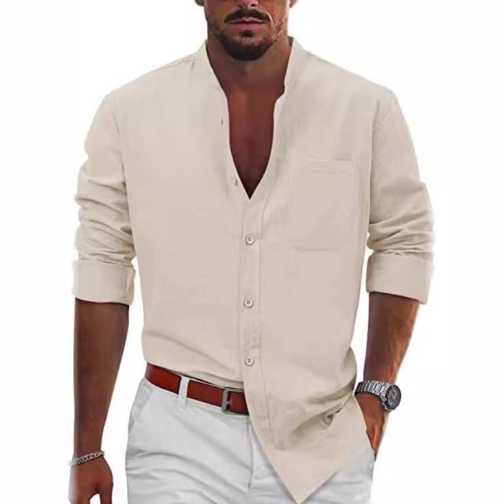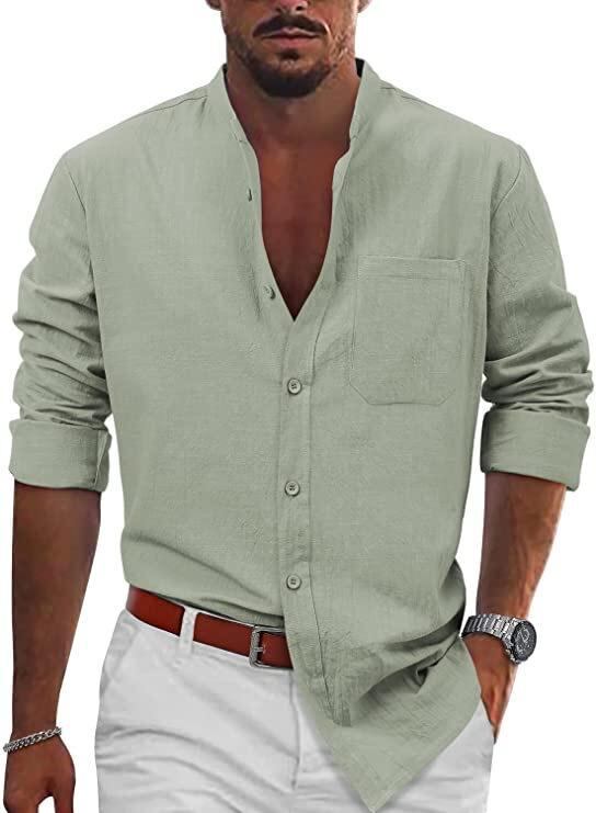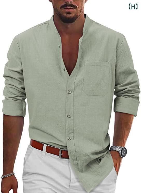 シャツ メンズ カジュアル 長袖 綿麻 コットンリネン スタンドカラー 無地 ゆったり ビッグシルエット 薄手 前開き ビーチ リゾート サマー 普段使い 定番カラー