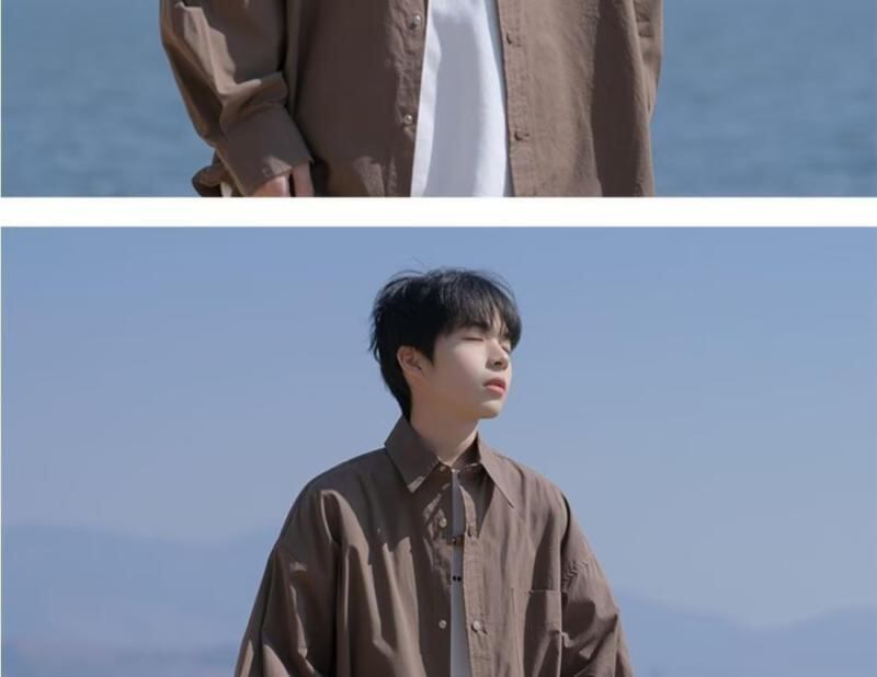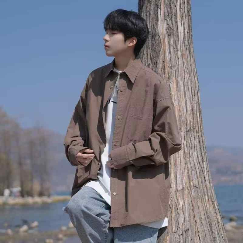 シャツ メンズ シティボーイ ストリート系 ルーズシルエット オーバーサイズ 長袖 開襟 薄手 軽量 ポリエステル 配色 ウォッシュ加工 カジュアル アメカジ 普段使い デイリーユース 夏物 ブラック ブラウン カーキ