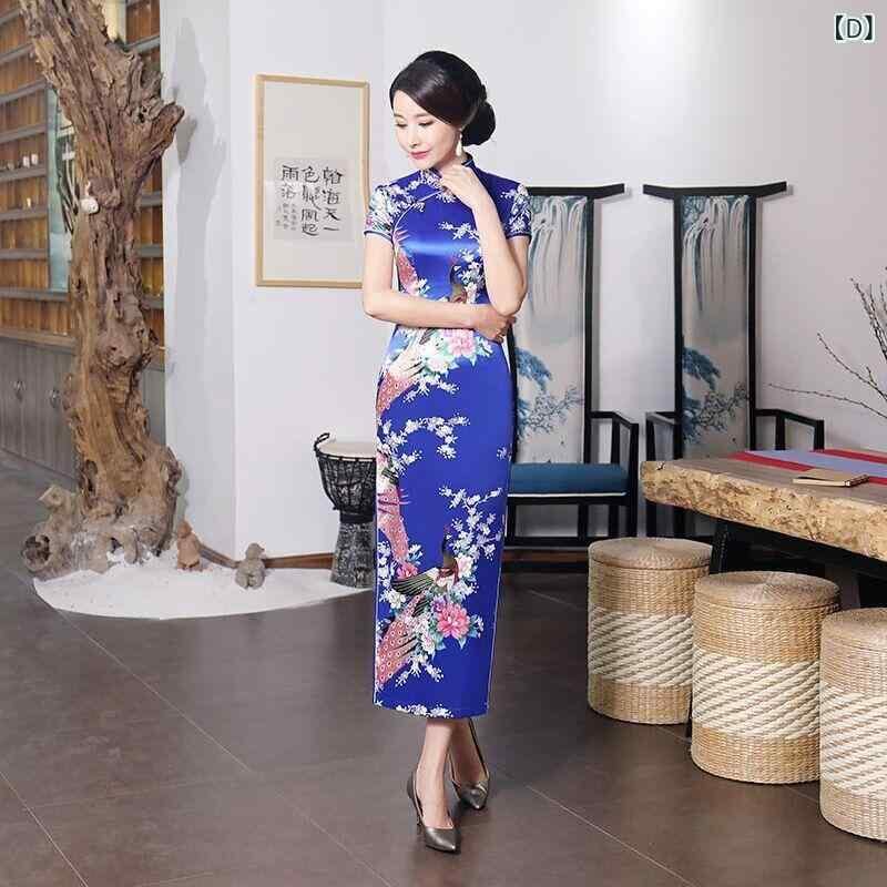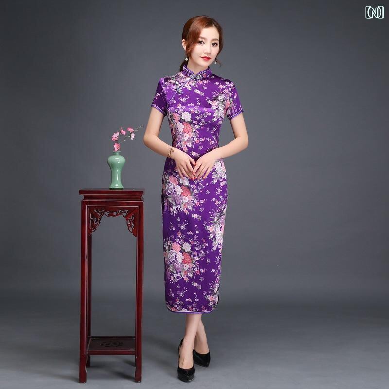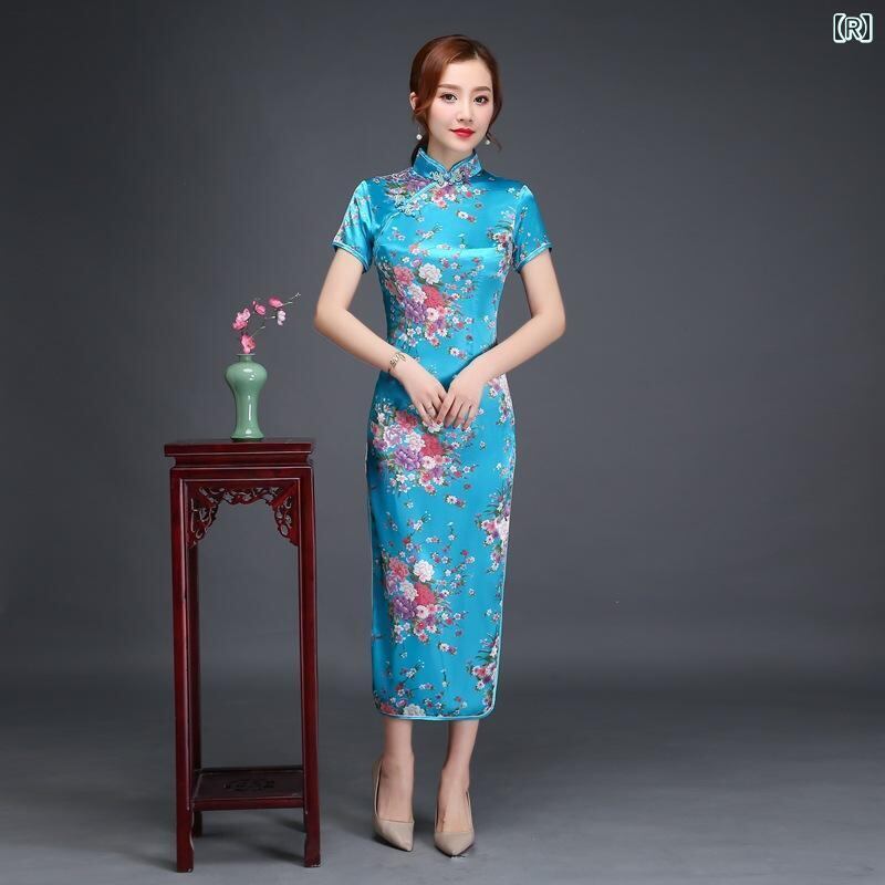 チャイナドレス レディース 大きいサイズ プラスサイズ 薄手 ロング丈 半袖 ラウンドネック ポリエステル エレガント 高級感 レトロ クラシカル おしゃれ 発表会 舞台 イベント フォーマルドレス
