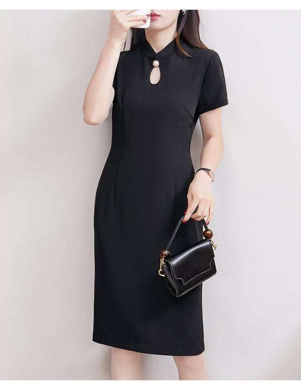 ワンピース 大きいサイズ レディース 夏物 改良チャイナドレス風 仕事用 事務服 フォーマル エレガント 体型カバー ゆったり 半袖 スタンドカラー 無地 ミモレ丈 タイトスカート 黒 ブラック ポリエステル