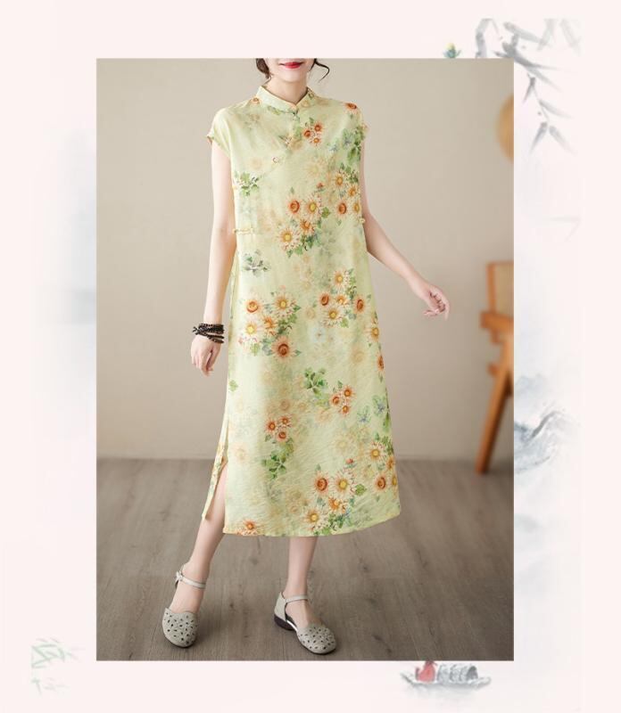 チャイナドレス レディース 大きいサイズ 改良 花柄 Aライン ホルターネック 半袖 ロング丈 体型カバー 着痩せ エレガント 通勤 アクリル素材 イエロー系 グリーン系