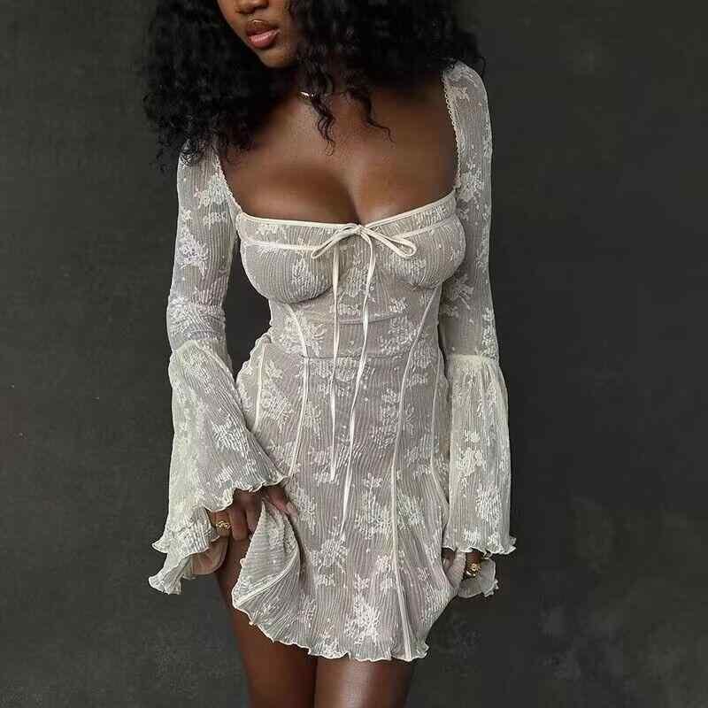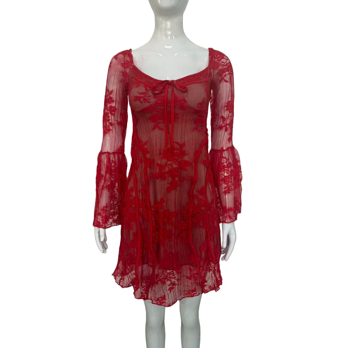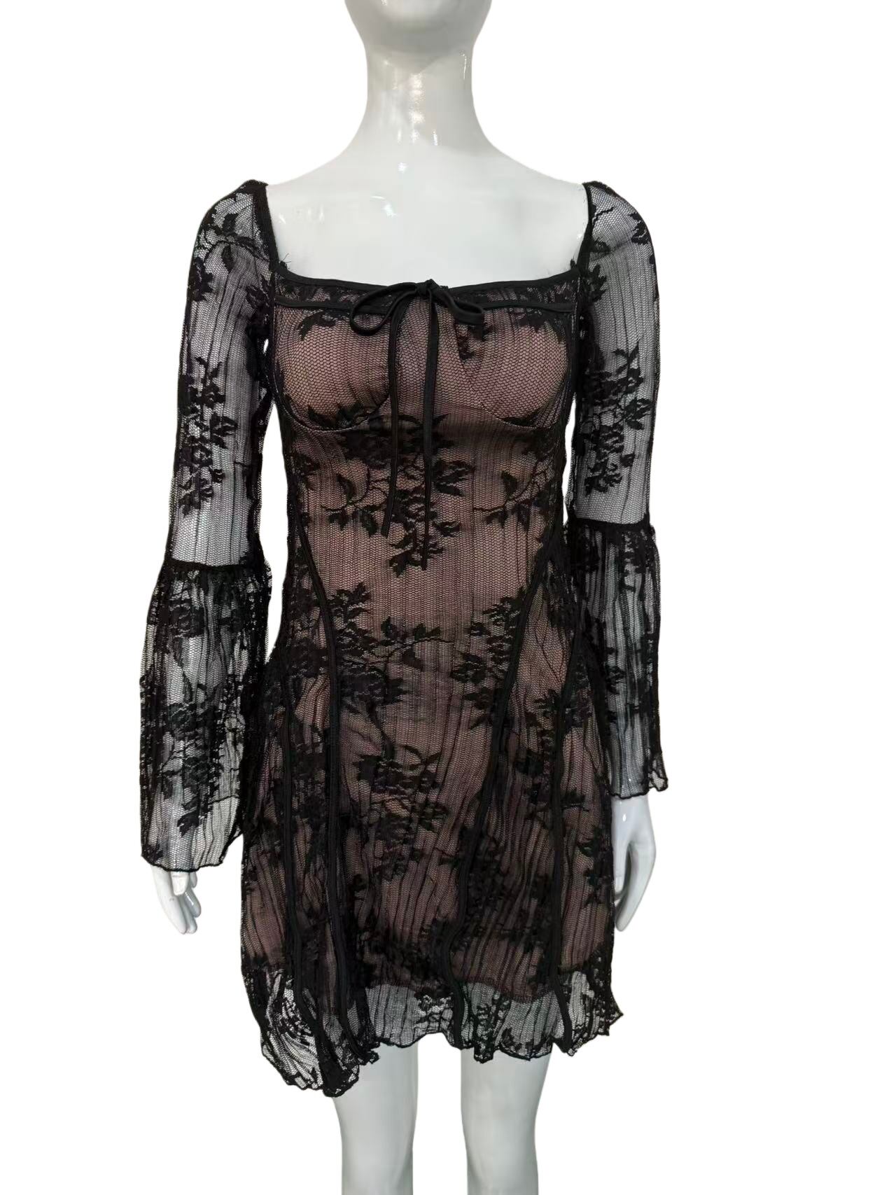 ワンピース レディース エレガント 上品 スタイルアップ レース 長袖 フレアスリーブ Aラインワンピース ウエストリボン ハイウエスト スクエアネック 透かし編み 無地 ナイロン ポリエステル ピンク ブラック レッド