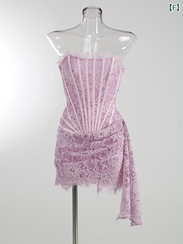 ワンピース レディース セクシー レース シアー ドッキング ウエストマーク ベアトップ エレガント 上品 パーティードレス 高級感 ポリエステル 無地 ギャザー ミニ丈 タイトシルエット ハイウエスト