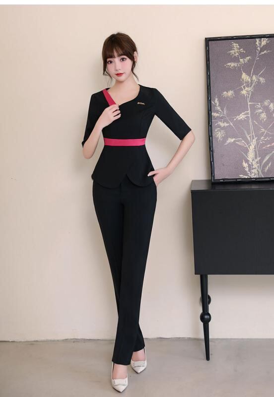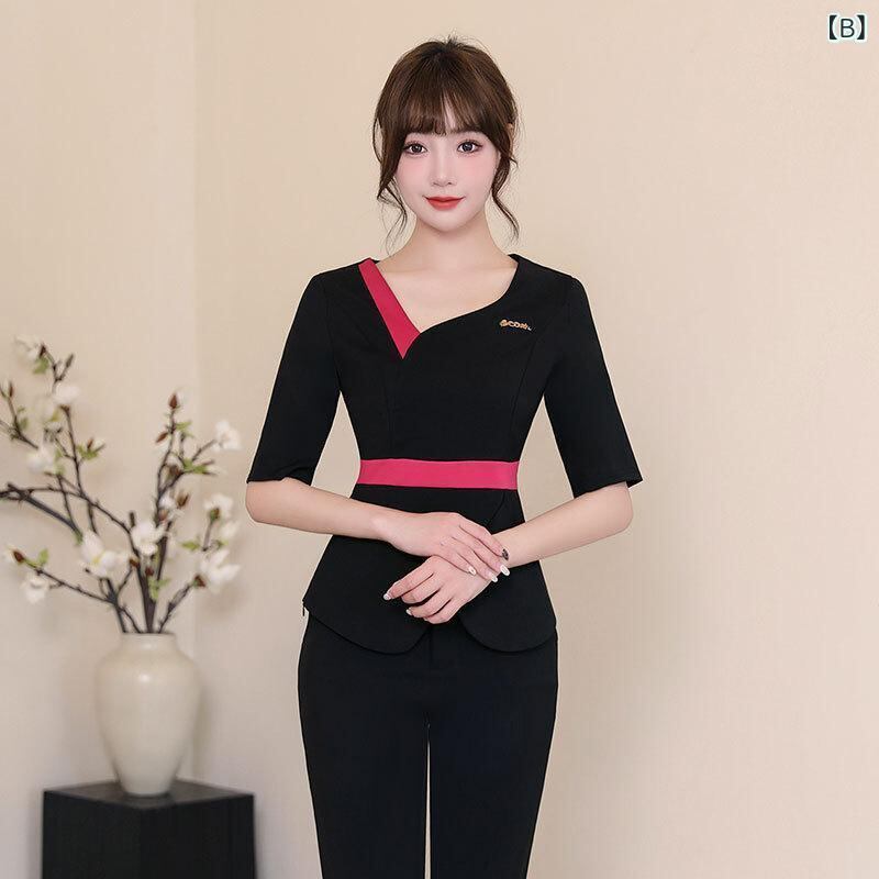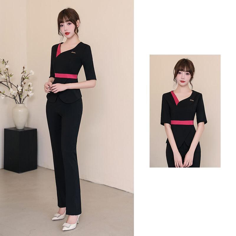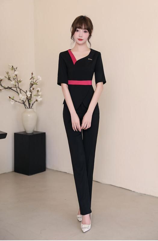 ユニフォーム レディース セットアップ 5分袖 ロングパンツ 美容師 エステティシャン セラピスト 施術着 制服 美容院 エステサロン フットケア 養生 リラクゼーション ワークウェア 高級感 上品 エレガント ポリエステル