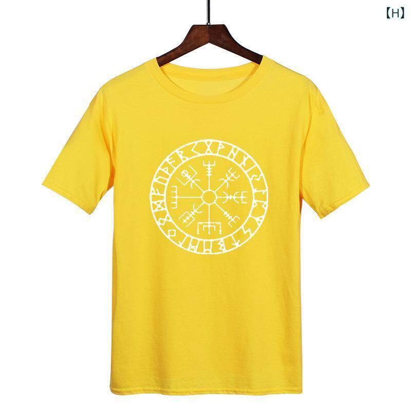 Tシャツ 男女兼用 北欧ルーン文字プリント カジュアル 半袖 クルーネック ストレートシルエット ポリエステル 再生繊維 抗菌加工 オールシーズン 白 黒 青 緑 黄色 ピンク 赤 灰