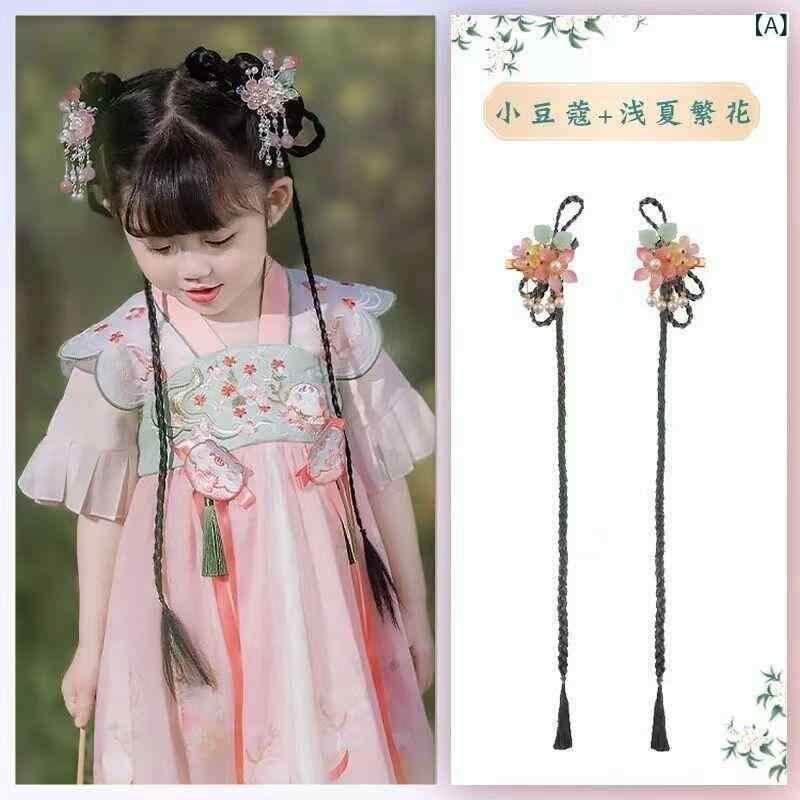 髪飾り 女の子 子供 中華風 レトロ 古風 付け毛 三つ編み 編み込み ウィッグ 一体型 手作り 発表会 舞台 イベント コスプレ アクリル 民族風 立体飾り リボン飾り ヘアクリップ 髪留め 揺れる簪