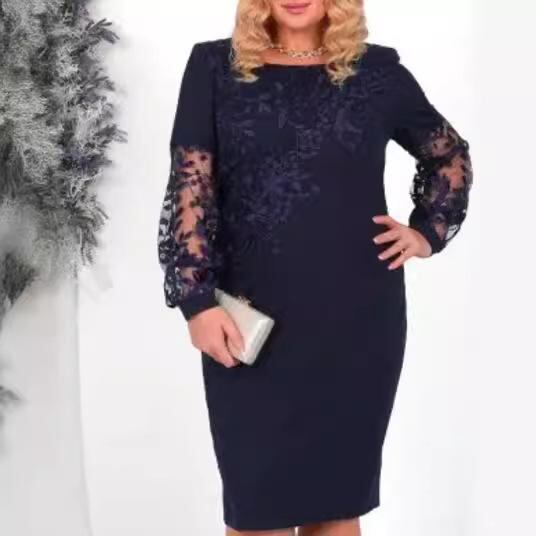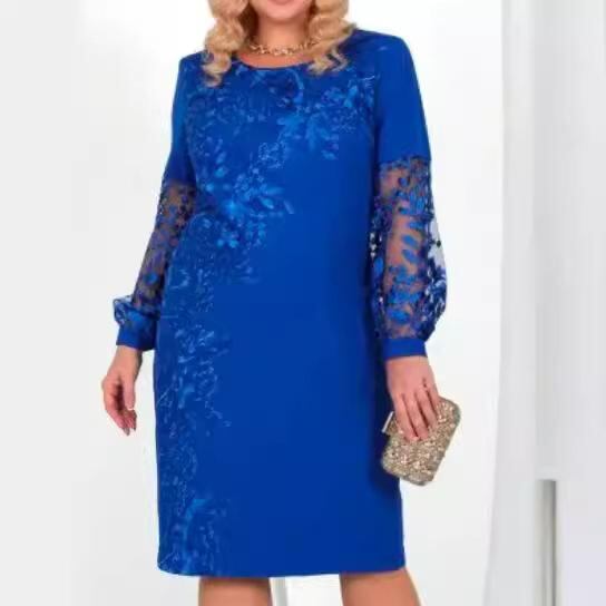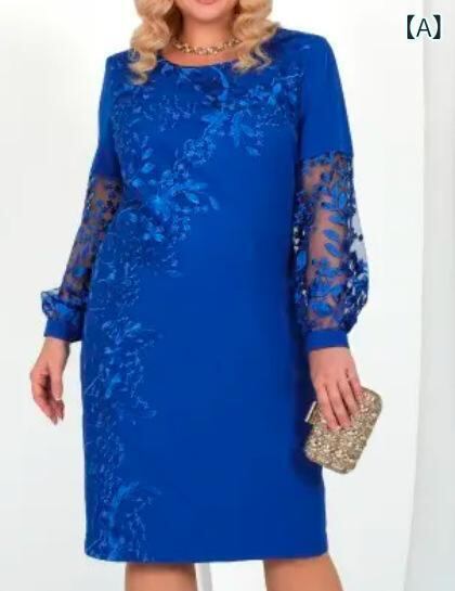 ワンピース 大きいサイズ レディース 長袖 花柄 レース 切り替え Aライン ミディ丈 ラウンドネック ポリエステル 上品 エレガント 通勤 オフィスカジュアル ブルー ブラック ピンク