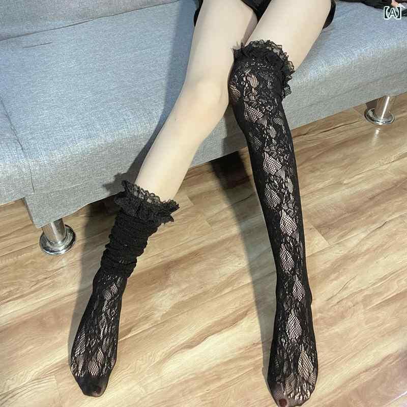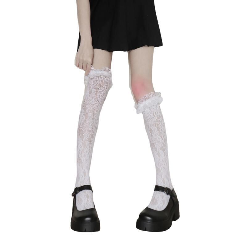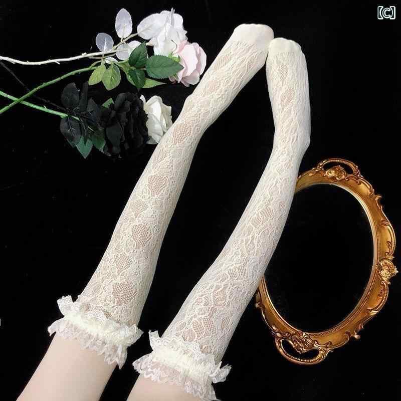 靴下 レディース ロリータファッション レース フリル ニーハイ 薄手 夏用 通気性 吸汗性 美脚効果 無地 アクリル ポリエステル ブラック ホワイト ベージュ