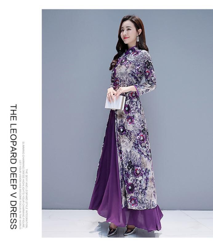ワンピース レディース 春 ロング丈 長袖 改良版 アオザイ風 チャイナドレス レトロ エスニック 綿素材 伸縮性 ボタン襟 斜め襟 上品 エレガント パープル